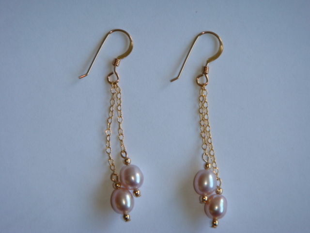 Naturally-coloured mauve rice pearls are simply matched with tiny gold-filled round beads, and hang from two different lengths of gold-filled fine cable chain on gold-filled earwires with tiny coil decoration. All metal components are 14K gold-filled. Earring length from top of earwire curve is 51mm. Rice pearl is 5.5-6mm long.