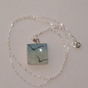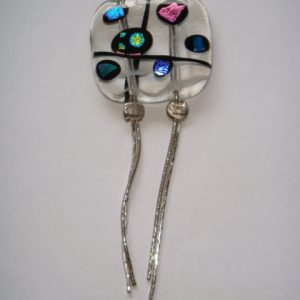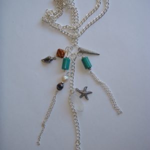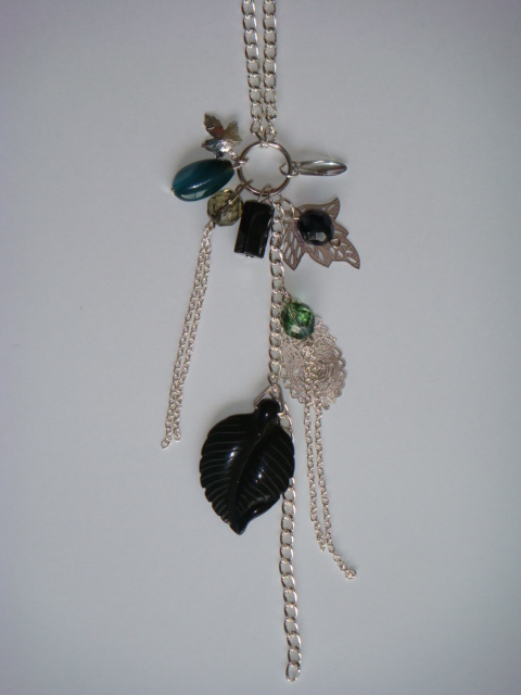 Cluster pendant in the contrasting sombre and clear colours of winter has a carved leaf in natural black obsidian complemented by faceted black agate, steel-blue agate, Czech fire-polished crystals in Montana blue, black diamond and tourmaline green, silver-plated filigree and leaf drops, and drifting strands of chain. Main silver-plated curb chain necklace is 67cm long, with a link size of 5.5mm. Black obsidian leaf is approx 36x25mm.