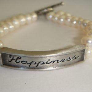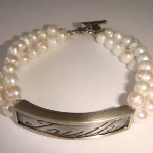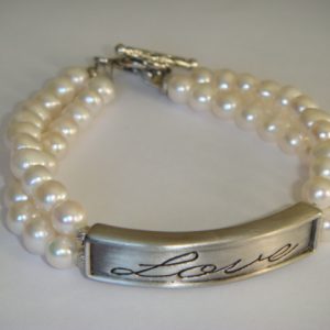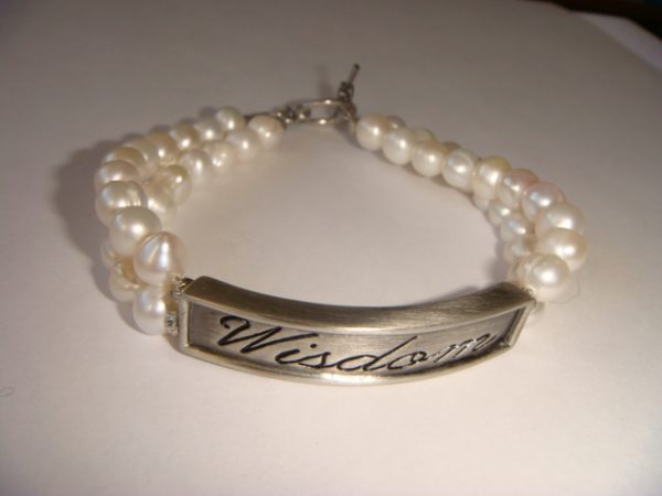 Double strands of smooth white freshwater pearls frame a curved rectangle of zinc alloy with antiqued-silver finish and engraved calligraphy of “Wisdom”.  Bracelet length is 20cm and finishes with a toggle clasp in lead-free pewter with an antiqued-silver finish.  Rectangle is 42.5x9x5mm and pearls are approx 7mm diameter.